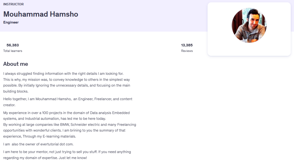 With a 4.6-star instructor rating, 13,000+ reviews, and over 56,000 students across his 11 courses, it’s safe to say he’s built a strong reputation in the online engineering education space. He’s not just an instructor—he’s a practitioner sharing years of hands-on experience in a format that’s practical, structured, and surprisingly fun to follow.
