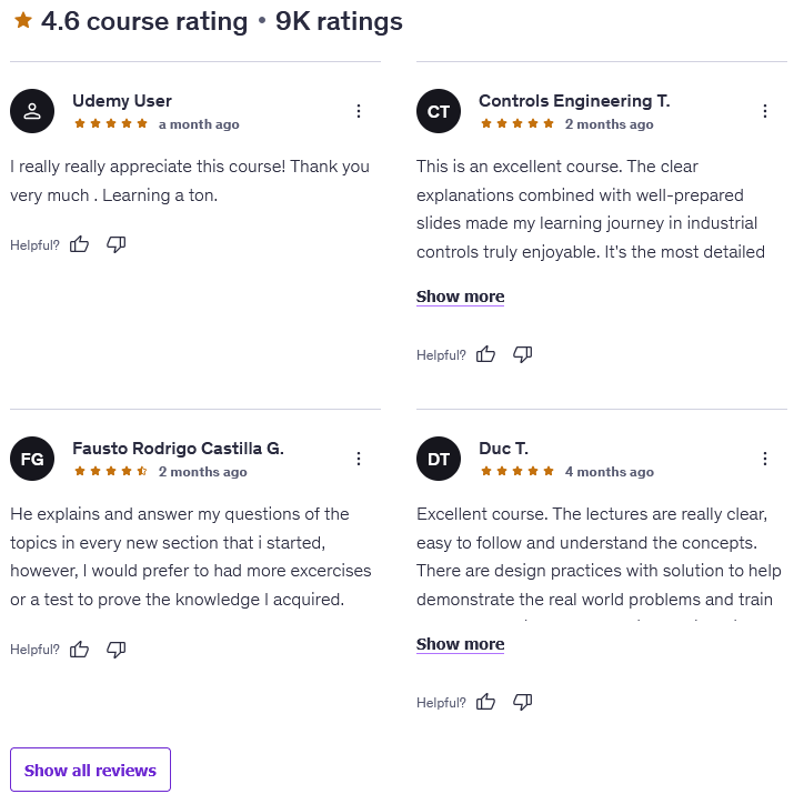 Student feedback backs this up too. Many reviewers describe it as one of the most well-structured and thorough courses on Udemy in the automation category. Some wish for more interactive testing or more real hardware examples, but they also recognize that the use of simulation software makes the learning process more accessible and cost-free—perfect for beginners who don’t yet have access to industrial equipment.