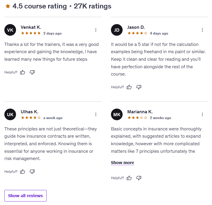 On the plus side, the real-world relevance of the lessons is a major highlight. The principles taught aren’t just academic—they show up in actual insurance contracts, risk assessments, and client interactions. Multiple students noted how the knowledge they gained was directly useful for their work or career aspirations. It’s this mix of theory and practice that makes the content worth your time. Overall, you walk away not just memorizing insurance terms, but understanding why they matter.