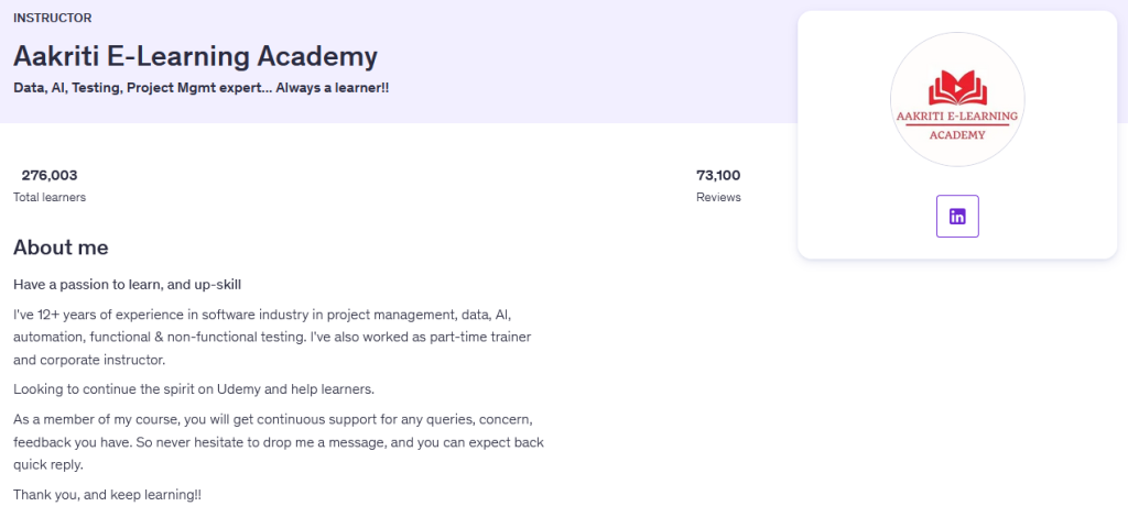 When it comes to Udemy instructors, experience and teaching approach make all the difference — and Aakriti E-Learning Academy brings both in spades. Led by an instructor with over 12 years of industry experience across data, AI, automation, and project management, this course benefits from someone who doesn’t just talk about AI — she’s actually lived it in real business environments. That blend of technical skill and management insight shapes how she teaches, turning what could be dense AI theory into digestible, real-world knowledge.