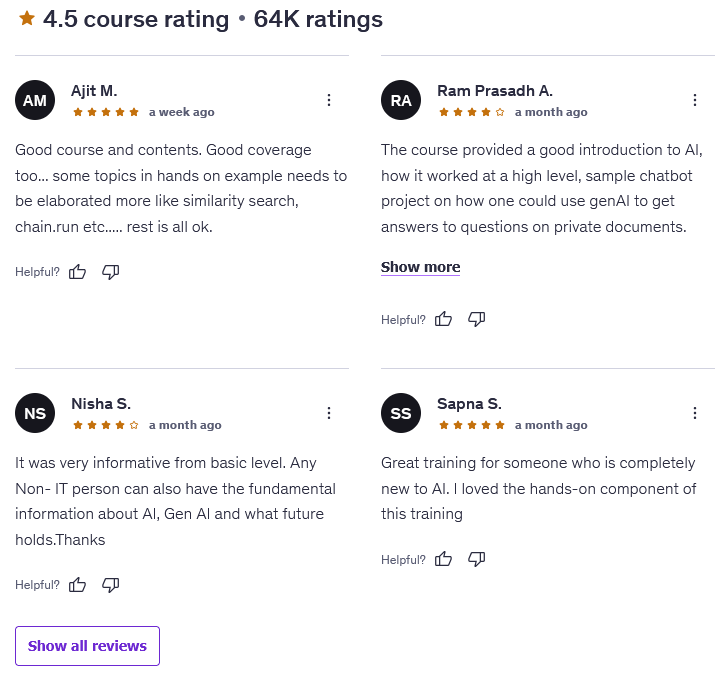 If there’s one small area for improvement, it’s depth in a few advanced areas like similarity search or LLM chaining. A handful of students mentioned wanting more elaboration there. But that’s less a flaw and more an opportunity for a future “intermediate” version of the course — because the groundwork this course lays is rock-solid.