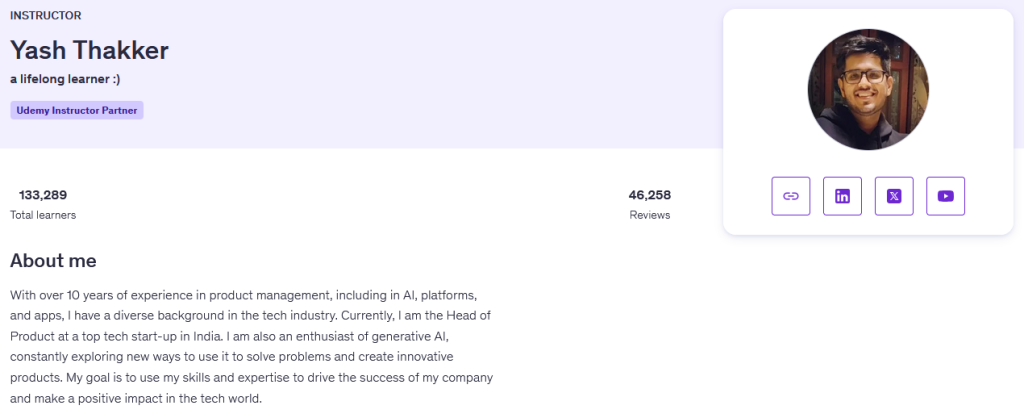 The instructor behind this course, Yash Thakker, brings a background that feels especially relevant for the audience this course is targeting. He isn’t coming at AI purely from an academic or engineering standpoint—instead, his experience is rooted in product management, business strategy, and real-world application. With over a decade of experience working across AI-powered platforms, apps, and digital products, his perspective feels grounded in how AI is actually used inside organizations, not just how it works in theory.