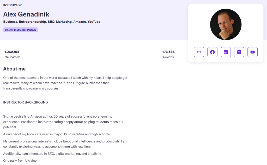 When it comes to Udemy instructors, Alex Genadinik is honestly in a league of his own in terms of sheer volume, reach, and consistency. With over 1 million students enrolled across more than 250+ courses, plus 170,000+ reviews, he’s clearly built a massive presence on the platform. That kind of scale doesn’t happen by accident—it usually means an instructor has figured out how to consistently deliver value in a way that resonates with a wide audience.